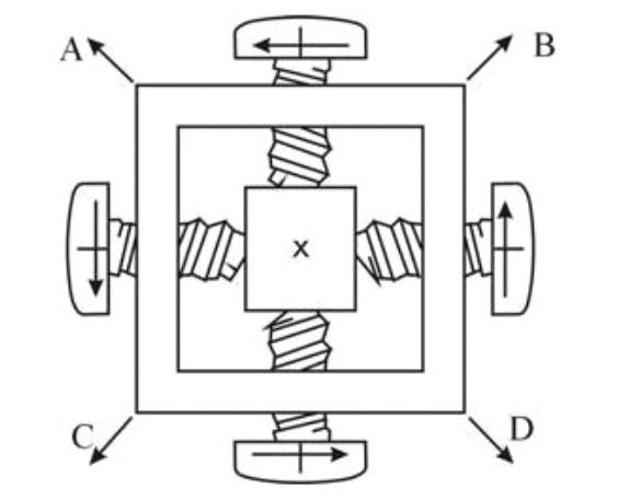 下图中若所有的螺钉在同一时刻按照给定的方向转动,中间的方块X应向______。