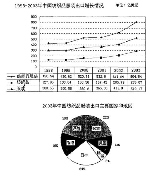 1998-2003年中国纺织品服装出口增长情况 单位:亿美元 下列说法正