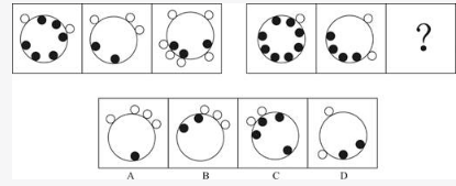第一步,观察特征。组成元素不同,优先考虑数量类或属性类。黑点和白点的数量特征明显,考虑数元素的个数。第二步,两段式,第一段找规律,第二段应用规律。第一段,图形黑点的个数依次为6、2、3,白点的个数依次为2、3、6,即6÷2=3,2×3=6;第二段应用规律,图形黑点的个数依次为8、4、?,白点的个数依次为1、2、?,8÷4=2,1×2=2,得到2个黑点和2个白点,只有D项符合。因此,选择D选项。