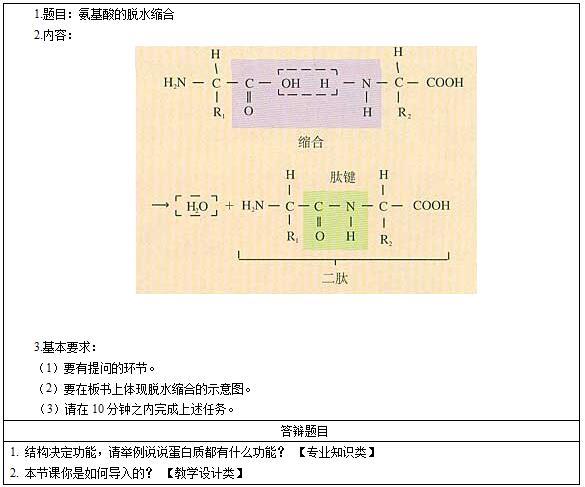 高中生物《氨基酸的脱水缩合》主要教学过程及板书设计教学过程(一)创设情境,导入新课用多媒体播放电影《蜘蛛侠》的片段。设问:电影中的主人公是谁?他最有力的武器是什么?紧接着用ppt分别展示黑寡妇蜘蛛和荧光水母的图片,设问:从这些画面中我们应该不难发现这些神奇的生命现象是由谁来承担的?从而导入新课。(二)引导学习,探索新知1.资料分析,探究氨基酸的通式ppt上展示拥有4种氨基酸的一个表格:让学生思考讨论如下问题:(1)四种氨基酸都由哪些元素组成?有什么共同特点?区别是什么?(2)如果将各氨基酸的不同部分作为R基(—R),尝试归纳氨基酸的通式。教师邀请两位学生主动到黑板上演板,其他学生尝试在纸上书写。并请学生评价演板的两位同学尝试写出的氨基酸的结构通式,教师最后总结,并针对错误进行说明。2.氨基酸脱水缩合反应让4个学生代表4种不同的氨基酸,进行角色扮演。尝试怎样才能连接起来。学生会很容易想到“手拉手”。通过此过程引导学生总结出“三肽”、“多肽”、“肽链”,以及一条肽链中“肽键数”、“脱去的水分子数”,和“氨基酸数”之间存在的数量关系。继续提出问题:7个同学手拉手形成一个多肽链,脱去多少水分子呢?12个同学拉手形成一个多肽链,脱去多少水分子呢?(三)巩固练习,思维拓展要求同学们总结归纳出教材上的思考题。结合学案上的练习,分析两个例题。(四)小结作业,课外延伸师生共同总结本节所学。学生结合课后作业题巩固这节课内容,并且与日常生活、现代相关科学相联系,了解蛋白质的应用价值。板书设计[img]/upload/tiku/397/8711534_1.jpg[/img]答辩题目解析:1.结构决定功能,请举例说说蛋白质都有什么功能?【专业知识问题】【参考答案】有些蛋白质是构成细胞和生物体的结构成分,如结构蛋白;有些蛋白质能够调节生命活动,如胰岛素;有些蛋白质有催化作用,如绝大多数酶都是蛋白质;有些蛋白质具有运输载体的功能,如红细胞中的血红蛋白;有些蛋白质有免疫功能,如人体内的抗体。2.本节课你是如何导入的?【教学设计问题】【参考答案】我采用的是情境创设的方式导入新课。具体做法是:用多媒体播放电影《蜘蛛侠》的片段。设问:电影中的主人公是谁?他最有力的武器是什么?紧接着用ppt分别展示黑寡妇蜘蛛和荧光水母的图片,设问:从这些画面中我们应该不难发现这些神奇的生命现象是由谁来承担的?学生根据已有的经验会很容易回答出:蛋白质。之后我继续设疑:那蛋白质有什么样的结构?它又有哪些功能呢?从而引出课题。通过设置疑问唤起学生兴趣,最大限度调动学生学习的积极性。