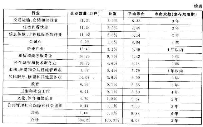 选项A,读表可知生存时间5年以下的企业占企业总量的比重为14.8%+14.0%+11.6%+8.9%=49.3%<50%,故选项C说法正确。选项B,读表可知,在5年内退出企业中比重最高的行业为批发和零售业。故选项B说法错误。选项C,读表可知,生存危险期为3年的行业有6个,为最多数。故本题答案为C。选项D,读表可知,退出企业最多的三个行业分别为批发和零售业、制造业以及租赁和商务服务业,其中租赁和商务服务业的生存危险期为2年。故选项D说法错误。