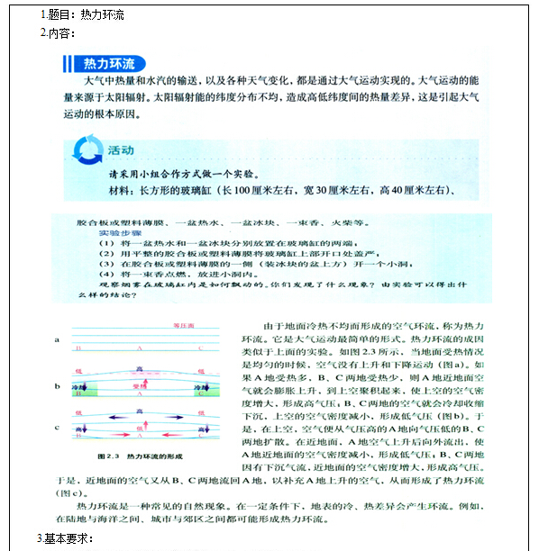 高中地理《热力环流》主要教学过程及板书设计教学过程环节一:导入新课设疑导入:给学生播放《军港之夜》。让学生看看歌词里面有哪些问题。进而导入课题。环节二:新课教学1.实验感知给学生展示实验:[img]/upload/tiku/397/8711468_1.png[/img][img]/upload/tiku/397/8711468_1_1.png[/img][img]/upload/tiku/397/8711468_1_2.png[/img]
