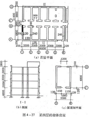 某四层砖砌体房屋的首层平面、剖面及屋顶间平面如图4-27。其中的屋顶间位于③、④