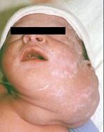 患儿,男性,半岁。出生后1个月发现左颊部膨隆,渐长大,低头时明显。检查外观如图。