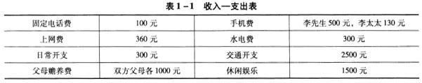 李先生一家的每月平均支出如表1-1所示。表1-1收入一支出表