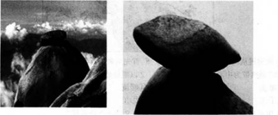 下面地貌由燕山期花岗岩组成,左图为飞来峰,其上的飞来石如天外来客(右图),读图回