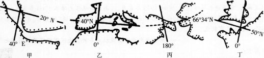 根据经纬度和区域轮廓图可知,甲、乙、丙、丁四个区域分别为曼德海峡、直布罗陀海峡、白令海峡、英吉利海峡。国际日期变更线位于180°经线上,但为避免在一个国家中同时存在着两种日期,实际日界线并不是一条直线,而是折线。它北起北极,通过白令海峡、太平洋,直到南极。故本题选C。