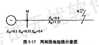 220kV线路(见图5-17)K点发生两相接地短路。电源、线路阻抗标么值已在图中注明,额定电压为220kV,基准容量为1OOOMVA。 图5-18是K点两相