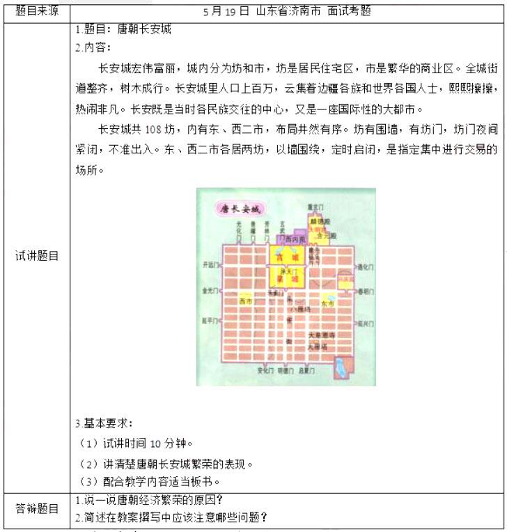 二、考题解析【教学过程】环节一:导入新课多媒体导入法。教师展示西安宣传视频,并引导学生:通过纪录片我们可以发现西安是一座文化底蕴很丰厚的城市,它在古代也被称作长安,曾是13朝古都,可以说见证了历史发展的风云变幻,今天我们就一起回到唐朝,走进长安,看看唐朝的长安城是怎样的景象?环节二:新课讲授(一)繁荣的长安城1.布局教师展示长安城的布局平面图,并提出问题:长安城的布局有什么特点?[img]/upload/tiku/397/10752859_1.png[/img]学生结合图片,回答问题:长安城宏伟富丽,城内分为坊和市,坊是居民住宅区,市是繁华的商业区,全城街道整齐,树木成行。教师继续展示唐朝大明宫的复原图,并提出问题:宫城和皇城有怎样的特点?从中可以给我们哪些启示?[img]/upload/tiku/397/10752859_1_1.png[/img]学生观看之后,回答问题:宫城和皇城的建筑非常的宏伟,富丽堂皇,这样的建筑能够体现出皇权的尊贵和至高无上。唐朝能够建成这样的宫殿,一方面说明了唐朝的国力强盛,另一方面也说明了统治者对于百姓的剥削比较严重。教师继续展示唐朝长安城的历史纪录片,请学生回答,长安城的坊市布局是怎样的?坊和市有什么特点?学生观看视频,回答问题:长安城共108坊,内有东、西二市,布局井然有序。坊有围墙,有坊门,坊门夜间紧闭,不准出入。东、西二市各居两坊,以墙围绕,定时启闭,市内规划整齐,同类商店集中在一起,成为“行”,行设行首,以便加强管理,征收商税。教师结合学生的回答,继续引导:长安的市只有东西两市,在数量上远远低于坊的数量,而且在时间和地点的管理上也要远远严格于对坊的管理,这是为什么呢?学生思考之后,回答问题:古代统治者提倡重农抑商的政策,认为商业是末业,因此都给与了严格的限制和管理。2.人口教师展示唐朝大食人俑和《弘法大师行状绘词》等图片,提出问题:生活在长安城的人口大约有多少?主要有哪些人??[img]/upload/tiku/397/10752859_1_2.png[/img]学生结合史料和课本内容进行回答:长安城里人口上百万,云集着边疆各族和世界各国人士,如大食人、日本人、新罗人等。教师继续引导:这样的局面的出现说明了什么?学生思考,回答问题:说明唐朝是一个开放的社会,长安既是当时各民族交往的中心,又是一座国际性的大都市。(二)长安城繁荣的原因教师引导:通过我们的学习,我们可以发现,用两个字就可以概括长安城的局面,那就是繁荣,为什么唐朝长安城如此繁荣呢?为什么它能够成为国际性的大都市呢?请同学们以历史小组为单位进行讨论。学生进行讨论,小组代表回答问题,教师进行总结:唐朝国立比较强盛,为长安城的繁荣奠定了物质基础,同时对于少数民族和外来民族有一种天然的吸引力;唐朝的民族政策和对外政策比较开放,这样有利于民族的融合,以及同外来文化的交流,有利于繁荣局面的形成;长安是。环节三:小结作业小结:师生共同总结本课主要知识。作业:课后请同学们以“繁荣的长安城”为题,创办一期主题板报。【板书设计】[img]/upload/tiku/397/10752859_1_3.jpg[/img]【答辩题目解析】1.说一说唐朝经济繁荣的原因?【参考答案】(1)农业、手工业的发展。(2)大运河的开凿,交通发达。(3)对外开放的政策。(4)国家统一,社会安定。2.简述在教案撰写中应该注意哪些问题?【参考答案】(1)突出学生的主体地位。(2)从学生的问题出发营造教学情境,设计教学问题并引导学生探究、解决问题。(3)设计出以任务型教学指导下的师生互动方式。(4)争取准备两、三种针对不同群体学生的教学安排。(5)对教材内容作适当的处理,发掘出教材内容之间的内在逻辑联系及育人作用。(6)课堂教学要减少统一讲解,增加学生的自主探究,增加学生的分组活动。