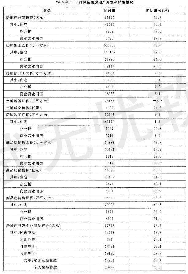 2013年1—9月份,全国房地产开发投资61120亿元,同比增长19.7%增速比1—8月份提高0.4个百分点。其中,住宅投资41979亿元,增长19.5%,增速提高0.3个百分点,占房地产开发投资的比重为68.7%。