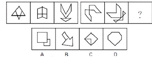 B本题考查图形的旋转规律,解题点在于箭头所指示的方向。题干五幅图形中,箭头所指示的方向分别为:下、右、上、左、下,即箭头方向依次逆时针旋转90°,故问号处图
