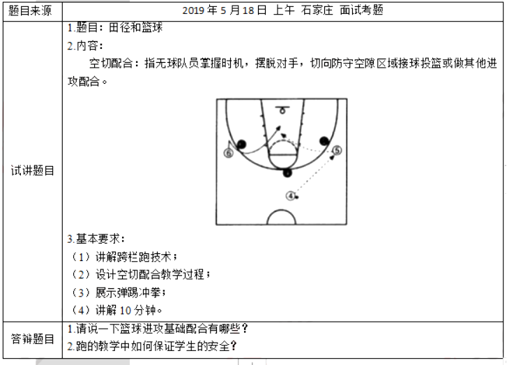 二、考题解析【教学过程】(一)开始部分1.课堂常规:体委整队,报告人数,师生问好,教师简要介绍教学内容,检查服装,安排见习生。组织教学:四列横队。要求:队列整齐,步伐一致。2.导入提问导入:同学们我们经常在篮球赛场上看到队员之间默契的配合从而顺利的得分,你们知道有哪些篮球进攻配合吗?今天老师就带领大家学习其中一个非常基础的进攻配合—空切配合。在练习过程中大家要互帮互助,注意安全。(二)准备部分1.运球绕篮球场跑2圈及基本步伐练习2圈要求:教师组织队形,慢跑的时候要求整齐。2.球操扩胸运动、腹背运动、上下绕球运动、球绕膝运动、弓步压腿运动、胯下换球运动、原地各种形式运球。要求:动作到位,舒展大方。(三)基本部分1.复习跨栏跑技术动作要领:(1)起跑至第一栏技术采用蹲踞式起跑,直道栏起跑后加速跑时,两腿、两臂协调一致,积极用力蹬摆,与短跑相比各步后蹬角度略大,身体重心位置较高,躯干抬起较早,跑到第六步后身体姿势已接近短跑的途中跑姿势,并准备起跨过栏;起跑后各步步长逐渐增大,栏前最后两步跑进更为积极,最后一步靠加快两腿剪绞动作和起跨腿积极着地而较前一步缩短步长10~20厘米,准确踏上起跨点,加快起跨速度。(2)途中跑技术过栏技术(跨栏步技术):过栏是跨栏跑完整技术的重要组成部分,它从起跨腿的脚踏上起跨点开始,到过栏后摆动腿的脚着地为止。跨栏步技术分为起跨攻栏、腾空过栏、下栏着地3个阶段。栏间跑技术:栏间要保持高重心跑,尽力减少身体重心上下起伏;大腿高抬,用前脚掌着地;步长相对稳定、步频加快。良好的跨栏周期节奏:重心高、频率快、节奏强,栏间三步步长的比例大小是小、大、中。(3)终点跑技术加强后蹬和摆臂,加快频率,以最快的速度冲向终点,离终点最后一步时,上体急速前倾,准确及时地用胸部接触终点线垂直面。2.新授空切配合(1)视频播放篮球比赛中空切配合以及教师和优秀学生代表示范空切配合提问:空切配合和一传一切的区别是什么?学生回答:空切配合是无球队员切入,而一传一切是持球队员传球后切入。组织教学:四列横队(2)结合战术板讲解空切配合战术要领无球队员掌握时机,摆脱对手,切向防守空隙区域接球投篮或做其他进攻配合。(3)练习①无防守的慢速空切配合练习。组织要求:学生自由组合,通过两人一组的形式进行练习,练习中要求学生不要追求速度,而是放慢节奏体会空切配合的方法和路线。②消极防守的空切配合练习。提问:教师提问,进行传切配合时,要注意哪些方面?教师总结:切入者的跑动路线,传接球的时机,队员之间的配合默契等,如果这些不能做到,在比赛中很有可能导致进攻失败,甚至会给对方快攻机会。③积极防守的空切配合练习。要求:防守者像正式比赛一样防守对位球员,进攻者需要灵活改变自己的站位以更好的进行空切配合。(4)检验环节—比赛展示方法:以每一列横队为单位,每列横队推选3名学生代表进行3V3半场比赛,采用交叉淘汰赛的形式进行,每场比赛时间为3分钟,进而决出名次。要求:在比赛中尽量多采用空切配合进行进攻,也可采取其他进攻配合。3.辅助教材—运球折返跑组织要求:(1)学生前后站成两排,一组同学练习时,下一组同学做好准备。(2)听教师口哨有序进行运球折返跑。(3)队伍有序,不影响他人练习。4.展示弹踢冲拳[img]/upload/tiku/397/10752701_1.png[/img](四)结束部分1.放松活动—配乐放松操组织教学:四列横队体操队形。要求:放松活动,身心充分放松。2.课堂小结:教师总结学练情况,表扬先进,激励全体学生。3.宣布下课、师生再见、回收器材。【答辩题目解析】1.请说一下篮球进攻基础配合有哪些?【参考答案】进攻基础配合包括:传切配合、掩护配合、策应配合和突分配合。2.跑的教学中如何保证学生的安全?【参考答案】(1)开始部分:需要在宣布课堂内容时强调安全要求。(2)准备部分:进行充分的热身活动,尤其是对易伤部分以及课堂中用到较多的部位。(3)基本部分:①练习中教师要巡视指导②对于学生的错误动作要及时指出③控制练习密度以及强度④维持好班级练习秩序⑤强调跑到终点后不要立即停止,需要继续往前慢跑或慢走一段距离再停止。(4)结束部分:充分的进行放松活动,拉伸疲劳处,尤其是针对易伤部位和本节课运动较多的部位。