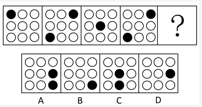 通过题干可以发现本题考点为图形推理中的位置-平移,由题干可以发现黑点较明显,而且数量变化为1、2、1、2,而且单数点在对角线上移动。故正确答案为B。