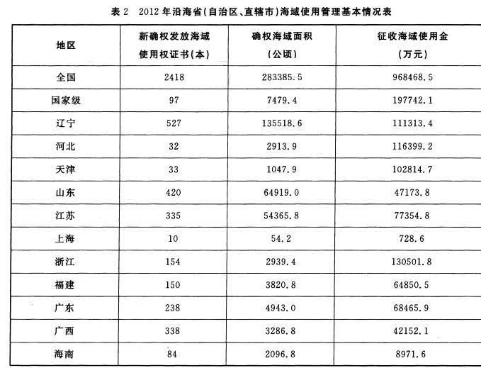 B.2012年沿海省(自治区、直辖市)新确权发放海域使用权证书(本)最多的省级地区是最少的地区的60多倍