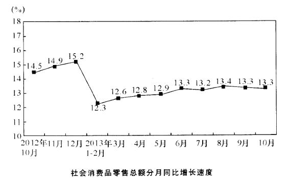 2013年10月份,社会消费品零售总额21491亿元,同比名义增长13.3%。其