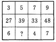 本题的规律是第一列的第一项加第三项之和的3倍等于第二项,即(3 + 6) X3 = 27;第三列的第一项加第三项之和的3倍等于第二项,即(7 + 4)X3 = 33;第四列的第一项加第三项之和的3倍等于第二项,即(9 + 7)X3 = 48。得到的规律是数列中每一列的第二项是第一项加 第三项之和的倍数。因此括号中的项为8,即5十8 = 13,39是13的倍数。