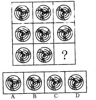 第一行中,图形的螺旋方向从内向外分别是:顺时针、逆时针、逆时针,小元素的位置逆时针旋转,在左上位置的元素始终为3个,其余两种元素分别为2个。第二行中,图形的螺旋方向由内向外分别是:逆时针、顺时针、逆时针,元素变化与第一行相同。第三行中,前两个图形的螺旋方向均是逆时针,故第三个图形应该是顺时针,排除C、D两项。A项有两种元素为3个,排除。本题正确答案为B。