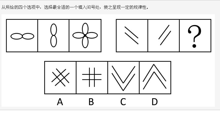 第一组图形中,第三个图形是第一、二个图形的中心重合叠加而成。第二组图形也应当符合这一规律,通过分析选项只有A项中图形符合。故正确答案为A。