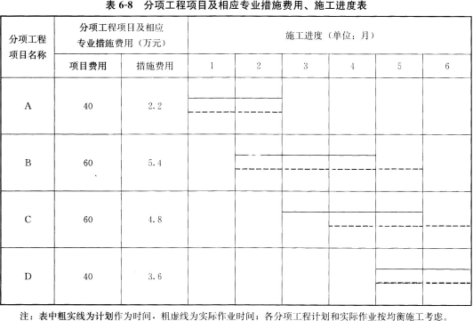 某工程项目业主采用工程量清单计价方式公开招标确定了承包人甲.双方签订了工程承包合同,合同工期为6个月。合同中的清单项目及费用包括:分项工程项目4项.总费用为200万元,相应专业措施费用为16万元;安全文明施工措施费用为6万元;计日工费用为3万元;暂列金额为12万元;特种门窗工程(专业分包)暂估价为30万元,总承包服务费为专业分包工程费用的5%;规费和税金综合税率为15%。 各分项工程项目费用及相应专业措施费用、施工进度,见表6—8。