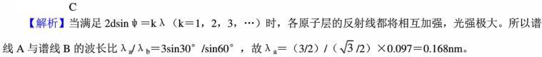 比较两条单色的X射线的谱线时注意到,谱线A在一个晶体的光滑而成30°的掠射角处给出第一级反射极大。已知谱线B的波长为0.097nm。谱线B在与同一晶体的同...