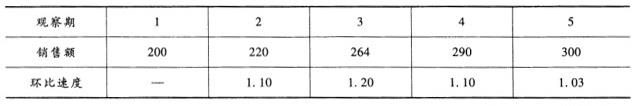 直线趋势延伸法的特点是:①适用于预测变量时间序列呈现直线长期趋势变动的情况;②对时间序列资料一律同等看待;③反映长期趋势的平均变动水平;④简便、可靠。 设一组时间序列为:Y<sub>1</sub>,Y<sub>2</sub>,…Y<sub>k</sub>其环比(发展速度)分别为G<sub>1</sub>,G<sub>2</sub>…G<sub>n-1</sub> [img]/upload/tiku/91/977288_1.jpg[/img]平均环比速度为[img]/upload/tiku/91/977288_1_1.jpg[/img] 第6期的销售额:[img]/upload/tiku/91/977288_1_2.jpg[/img]=254.8(万元) 定性预测方法包括:集合意见法与专家会议法、德尔菲法、联测法、转导法、类比法、指标预测法。