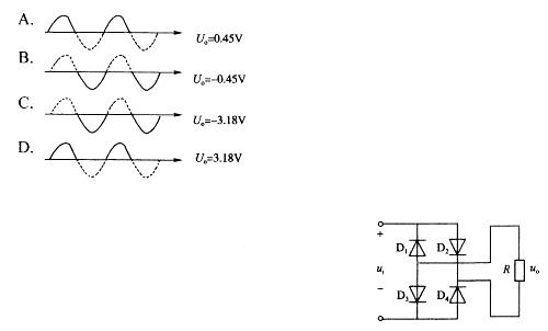 提示 该电路为二极管的桥式整流电路,当D2 二极管断开时,电路变为半波整流电路,输入电压的交流有效值和输出直流电压的关系为U0=0. 45Ui,同时根据二极管的导通电流方向可得U0=-3. 18V。