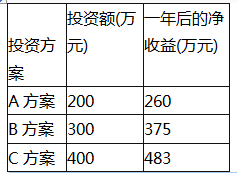 某建设项目现有A、B、C三种施工方案。三种施工方案的投资额及一年后的净收益率见下表。
