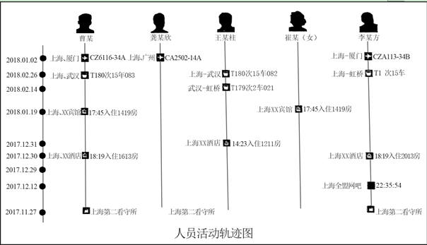 A项龚某欣和曹某的行动轨迹仅在看守所有一次重合,可能性较小,排除。B项王某柱和曹某的行动轨迹没有完全重合,可能性相对较小,排除。C项,崔某和曹某的行动轨迹只有一次重合,但是二人在同一时间入住同一宾馆的同一房间,故二人必然互相认识,崔某(女)是曹某同伙的可能性较大。D项,李某方和曹某的行动轨迹仅有一次入住宾馆重合,但是并非同一房间,为同伙的可能性相对较小,排除。故本题正确答案为C。