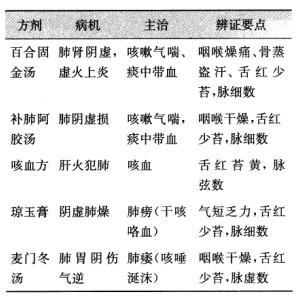 本题考查百合固金汤的主治。“咽喉燥痛”——肺阴虚;“骨蒸盗汗”——肾阴虚;“手足心热、舌红少苔、脉细数”——阴虚。百合固金汤一一肺肾阴虚,虚火上炎之咳嗽气喘、痰中带血。补肺阿胶汤——肺阴虚损之咳嗽气喘,痰中带血。咳血方——肝火犯肺之咳血。琼玉膏——阴虚肺燥之肺痨。麦门冬汤一一肺胃阴伤气逆之肺痿。详见下表: