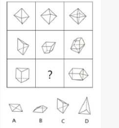 第一步,观察特征。组成元素相似,图形之间有相似的立体图,优先考虑样式类运算。第二步,九宫格,横向规律较为常见,优先考虑。观察九宫格发现,第一、二行,前两个立体图形拼接起来组成第三个立体图形,第三行应用规律,问号处应为图3右面的四面体,排除B、C项;进一步观察,D项的比例不对,只有A项符合。