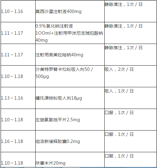 患者,男,72岁,体重55kg,因“因反复咳嗽、咳痰5年,气短2年,加重1周”之主诉入院。既往有轻度前列腺增生病史。人院后患者呼吸困难加重,查体:T 36.8℃,BP 130/88mmHg,P 1002次/分,R28次/分,颈静脉怒张,桶状胸,双肺可闻及少量细湿性哕音,未闻及干哕音,双下肢轻度水肿。血气分析示轻度低氧血症。电解质:K+3.5mmol/L,Na+136mmol/L,Cl-103mmol/L。血常规未见明显异常。以“慢性阻塞性肺疾病急性加重期”收住院,否认食物、药物过敏史。医嘱: