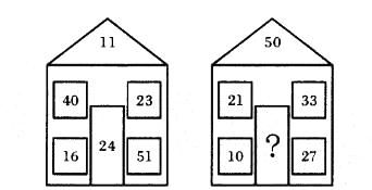 窗户和屋顶上的数字个位数和十位数相加后等于门上的数字,1 + 1 + 4 + 0 + 2 + 3 + 1 + 6 + 5 + 1 = 24→? =5 + 0 + 2 + 1 + 3 + 3 + 1+0 + 2 + 7 = 24,故本题正确答案为 A。