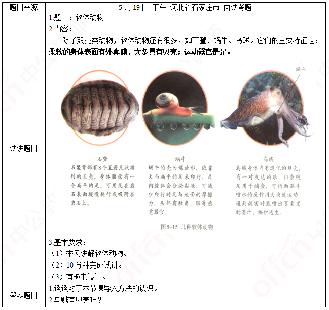 【答辩题目解析】1.谈谈对于本节课导入方法的认识。2.乌贼有贝壳吗?