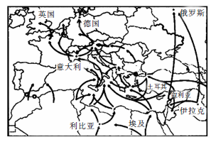 下图为2015年8月~2016年3月涌入欧洲的难民迁移路径示意图。读图完成第下题。