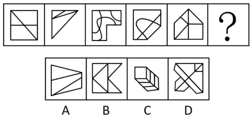 本题属于图形数量类题目。题干图形面的个数分别为4、3、6、5、5,外部轮廓图形线条数分别为4、3、6、5、5,可知图形中面的个数与图形外部线条数数量相等。B选项符合,当选。因此,选择B选项。