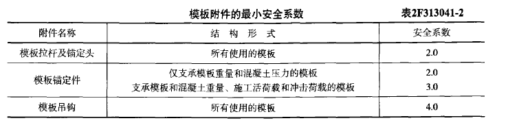 新教材P95 模板附件的安全系数,应按表2F313041-2采用,模板拉杆及锚定头的最小安全系数为2.0。