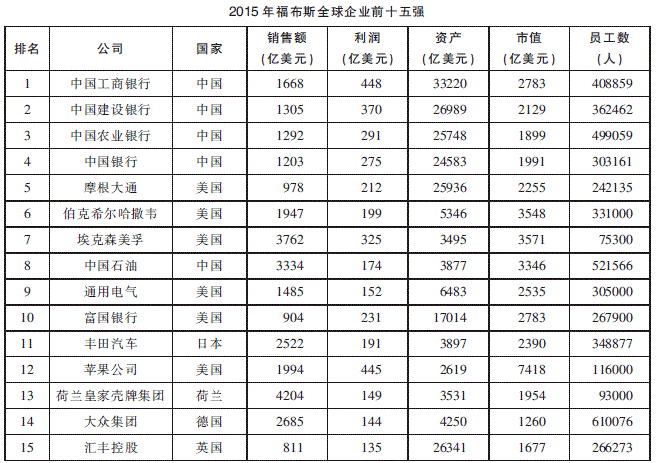 2015年福布斯全球企业前十五强 2015年福布斯全球企业前十五强