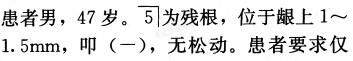 患者男,45岁,在某诊所作右下后牙固定修复体3年,近来义齿松动,口臭,右下后牙自发性疼痛,夜间明显。查:右下6缺失,右下75为桥基牙,金属全冠固位体颈缘下...