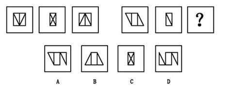 第一幅图中,将第1个图形看成左右两个部分,分别向右,向左移动,顺次可以得到第2个,第3个图形。第二幅图中,将第1个图形看成三部分,中间的不动,左右两边的相向移动,先会得到第二个图形,接下来将得到如D选项所示的图形。故答案为D。
