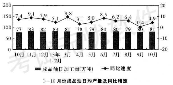 2013年1—10月份,主要石化产品产量稳步增长。原油加工量39687万吨、成品油产量24530万吨、乙烯产量1325万吨,同比增长4.1%、5.2%、7...