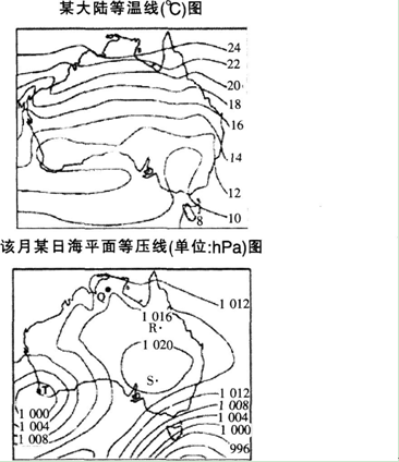 读“某大陆等温线(℃)图”和“该月某日海平面等压线(单位:hPa)图”,