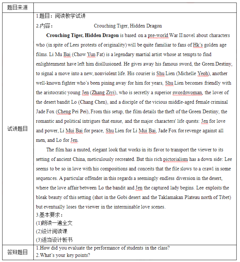 二、考题解析【教案】Teaching aims:Knowledge aims:(1) Students are able to understand the content of the passage.(2)After this lesson, students can know the writing style of film critics and know more information about “Crouching Tiger, Hidden Dragon”.Ability aim:Students can use different basic reading strategies like predicting, grasping details correctly in their reading process.After this lesson, students can evaluate the film “Crouching Tiger, Hidden Dragon” objectively.Emotional aim:Students are able to love Chinese traditional culture.Key and difficult point:Key Point: understand the content of the passageDifficult Point: use this different basic reading strategies to deal with different reading questions.Teaching procedures:Step 1: Warming-up1. Greetings.2. Play a video: The teacher show the fragment of “Crouching Tiger, Hidden Dragon” and ask students if they know anything about the film.3.Then tell students this fragment is about two main characters. Then lead in the topic of today: “Crouching Tiger, Hidden Dragon”.Step 2: Pre-reading1. Ask students if they know the background of the movie. Then ask one student to answer the question.2.Give evaluation to the students, then tell students the background of the film.The film tells the story of a generation of heroes, Li Mubai, who has withdrawn from the all corners of the country. He entrusts the confidante, Le Xiulian, to bring his Qingming sword to the capital, and presents it as a gift to the Baylor collection. The fact that Li Mubai’s retreats from the all corners of the country actually causes more grievances.Step 3: While-readingA. Extensive reading1.Let students to read the passage for the first time. Ask students a question: What do you think this article might be chosen from?( This passage may be chosen from a movie magazine.)2.Then let one student answer the question and give evaluation.B. Intensive reading1.Let students to read the passage for the second time. Write down two questions on the blackboard:1).What kind of details are mentioned in the film?2).Please find the down side of the film.2.Then invite two students to answer these questions separately and give evaluation. Write down the right answer on the blackboard.1).The film details the theft of the Green Destiny, the romantic and political intrigues that ensue, and the major characters life quests.2).Lee seems to be so in love with his compositions and conceits that the film slows to a crawl in some sequences.Step4: post-reading1. Retell the film according to the key details on the blackboard.2. Make Discussion: Ask students to talk about which character do you like best, and why?Step5: Summary and HomeworkSummary: ask a student to conclude the content of the lesson and summarize with the whole class.Homework: Watch this movie completely and try to write a short films critics.[img]/upload/tiku/397/10752591_1.png[/img]【答辩题目解析】1.How did you evaluate the performance of students in the class?【参考答案】Students are unique and developing individuals. And they are eager for teacher’s approval and encouragement.Therefore, in my class, as long as students shared their answers actively, I would give them positive and reasonable evaluations, for example, “Your pronunciation is improving”, “You found the answer so fast”. If students made mistakes, I encouraged them like “You are very brave” “Think it over and try again.” and guided them to get the right answer. In this way students will not lose their confidence in learning English and will be more active in my class.In the future, I will try my best to find more methods to encourage my students to let them study actively.2. What’s your key points?【参考答案】The key points is that students can understand the content of the passage.