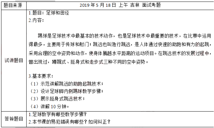 二、考题解析【教学过程】(一)开始部分课堂常规:体委整队,报告人数,师生问好,教师简要介绍教学内容,检查服装,安排见习生。组织教学:四列横队。要求:队列整齐,步伐一致。(二)准备部分1.热身跑方法:四路纵队围绕操场进行慢跑。要求:注意安全,避免相撞。2.足球操组织教学:四列横队,体操队形。要求:动作到位,节奏感强。(三)基本部分1.复习:起跑后加速跑技术的动作要领(1)示范正面示范和侧面示范(2)动作要领起跑后,第一步落地不要有任何停顿和跳动现象,后蹬快速、充分、有力,摆动腿积极前摆、下压,用前脚掌着地,两臂配合两腿,快速有力地前后摆动。加速跑的特点是身体前倾较大,频率快,步长逐渐增加,脚的落地点在身体重心投影点附近,随着步幅和速度不断加大,上体逐渐抬起转入途中跑。组织教学:组织学生在规定场地练习,教师边做示范,边提示注意事项,语言激励学生,及时表扬鼓励。要求:动作到位,舒展大方。2.新授:脚背内侧踢球(1)导入:同学们我们经常在足球比赛中看到一些足球运动员能够踢出弧线球,以出其不意的角度射门成功,并且人们还专门给这种球起了好听的名字,银月弯刀、香蕉球,那么像这种球是如何踢出来的呢?又是如何踢好它的呢?今天我们就来学习这个技术—足球脚背内侧踢球。(2)示范正面示范及侧面示范组织教学:学生分列式站立,观察模仿(3)讲解技术动作动作要点:斜线助跑,助跑方向与出球方向约成45°,最后一步稍大,以支撑脚底积极着地,脚尖指向出球方向,距球内侧后方约20~25厘米,膝关节微屈。在支撑同时,踢球腿以髋关节为轴大腿带动小腿由后向前摆动,当大腿摆至与支撑腿接近同一平面时,小腿做爆发式摆动,此时脚尖外转、脚背绷直,以脚背内侧部位触击球。击球后踢球腿及身体继续随球向前。(4)练习①踢固定球练习。组织教学:两人一组一人脚踩球,一人上两到三步踢固定球练习。②踢定位球练习。组织教学:二人为一组间隔八米十米互相进行脚内侧传球练习。纠错:踢球力量小;原因可能是踢球腿摆动幅度小,或者身体出现前倾、后仰这样的现象。纠正方法:两人为一组语言提醒加大踢球腿摆动幅度,以及在踢球时加摆手动作。③行进间传球练习。组织教学:同学们两人为一组,间隔八到十米进行行进间互相传球的练习。(5)检验—射门比赛。3.展示“自己抛球—脚内侧接球—曲线运球—脚背正面踢球”组合技术”。示范方法:侧面示范要求:动作标准,激发学生学习兴趣。(四)结束部分1.放松活动—配乐放松操。组织教学:四列横队体操队形。要求:放松活动,身心充分放松。2.课堂小结:教师总结学练情况,表扬先进,激励全体学生。3.宣布下课、师生再见、回收器材。【答辩题目解析】1.结合本节课,谈一谈你如何在教学中激发学生的主动性?【参考答案】学生是课堂的主体,教师是组织者,引导者,体育课的目的也是为了提高学生的身体素质,激发运动兴趣,所以,我在体育课中为让学生掌握动作技术必不可少的教学方法就是讲解与示范的方法,教师的示范让学生的在脑海里形成表象的认识,再通过语言让学生对于动作有更清晰的认识。除了讲解与示范的教学方法以外,我还根据动作技术的特点采用了分解练习和游戏竞赛法。让学生在游戏与练习中逐层体会,激发学习兴趣,也培养遇见困难勇往直前的意志品质。2.请说出在练习过程中易犯的错误,如何改进,三处即可。【参考答案】易犯错误:助跑方向不对支撑脚的位置偏后,易把球踢高。纠正方法:用线标出支撑脚的位置进行练习。易犯错误:踢球脚脚尖外转不够,接触球部位不正确。纠正方法:踢固定实心球练习,强调脚触球的部位。易犯错误:没有向出球方向摆腿,形成向内画弧摆动,折体弯腰。纠正方法:多做模仿练习,强调立足后转体,摆动腿向出球方向摆动。