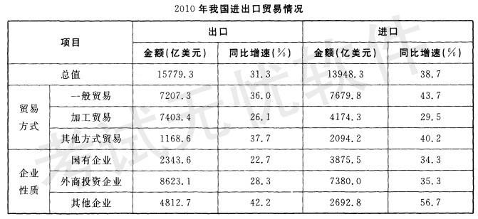 2010年,我国进出口贸易总额为29727. 6亿美元,同比增长34. 7%。 2010年,我国机电产品出口 9334. 3亿美元,同比增加30.9%;高新技术产品出口 4924.1 亿美元,同比增长30. 7%。船舶、汽车零部件出口保持较快增长,其中船舶出口同比增长 44.5%,汽车零部件出口同比增长44. 1 %。
