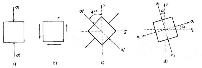 提示:题图单元体的主方向可用叠加法判断。把图中单元体看成是单向压缩和纯剪切两种应力状态的叠加,如解图a)和b)所示。 其中,图a)主压应力σ'3的方向即为σy的方向(沿y轴),而图b)与图c)等价,其主应压力σ''3的方向沿与y轴成45°的方向。因此题中单元体主力主应力σ3的方向应为σ'3和σ''3的合力方向。根据求合力的平行四边形法则,σ3与y轴的夹角σ必小于45°,而σ1与σ3相互垂直,故σ1 与x夹角也是a