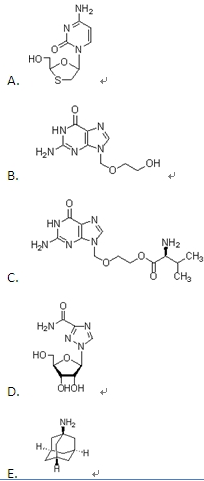 此题考查的是抗病毒药的结构特征。可以根据药物分类进行判断,拉米夫定属于非开环核苷类,阿昔洛韦属于开环核苷类,利巴韦林和金刚烷胺都属于非核苷类。利巴韦林结构中含有三氮唑,金刚烷胺结构中含有的是三环状胺。C的结构是伐昔洛韦。