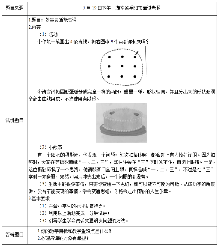 二、考题解析【教学过程】(一)故事导入1.讲述故事刘华接到了两份邀请,而且刚好两个活动在同一天。正在两难时,刘华想到了一个好办法,把参加生日聚会的同学请到足球比赛现场为比赛加油,比赛结束后,大家有一起为婷婷祝贺生日。这不是两全其美吗?最后活动很成功,大家玩的都很开心。2.交流讨论师:你在生活中遇到过类似的事情吗?你是怎么处理的?生:有遇到过这种两难境地,我是当时也是考虑如何能做到两全其美,最终用反常规的思维让问题得到了解决。3.提出主题在学习、生活中,我们总会遇到大大小小的问题或者困难,有时候我们感到苦闷,觉得问题无法解决,好像走进了死胡同,或者是处在了两难的局面。这时候只要我们懂得灵活变通,就会出现柳暗花明又一村的结果。今天我们就来学习《处事灵活能变通》。(二)主题活动一:思维变通小游戏1.讲述规则(1)你能一笔画出4条直线,将右图中9个点都连起来吗?[img]/upload/tiku/397/10752788_1.png[/img](2)请尝试将圆形蛋糕分成完全一样的两份:重量一样,形状相同,并且分出来的形状必须全部由曲线组成,不准使用直线段。[img]/upload/tiku/397/10752788_1_1.png[/img]2.完成活动3.交流讨论师:完成游戏的过程中有没有遇到困难,是怎么解决的?生:刚开始没有找到解决方案是因为受到固定思维的限制,后来突破了常规思维解决了问题。4.教师小结有时候,我们需要改变思考的方向,甚至反向思考,这样思考的结果常常会让看起来不可能的事情变成现实。(三)主题活动二:阅读天地1.讲述故事(1)一个农民有一块贫瘠的土地,不长庄稼,却可以长杨树。杨树树干可以生产各种工具和家具,枝条可以边框。在农民的辛苦经营下,那块谁也不想要的土地却变成了他的聚宝盆。(2)有一个细心的摄影师,他发现一个问题:每次拍集体照,都会赶上有人恰好闭眼。因为拍照时,大家在等摄影师喊“一、二、三”,却往往会在“三”字时顶不住,而闭上眼睛。于是,这位摄影师换了一个思路,他请顾客们全闭上眼,同样是喊“一、二、三”,不过是在“三”字时一齐睁眼,果然,照片冲洗出来后,一个闭眼的都没有。2.完成活动3.交流讨论师:我们的生活中遇到类似的事情吗?你是怎样灵活而变通地处理困难的?生1:在生活过程中会遇到一些问题,但灵活变换一下方向,把阻力变成前进的动力。生2:多观察,做生活的有心人。4.教师小结生活中的很多事情,只要你变通一下思维,就可以变不可能为可能。从成功学的角度讲,没有不能实现的事情。学会变通思维,你将会走出精彩的人生乐章。(四)课外拓展生活中总会遇到烦恼的时候,向爸爸妈妈征集意见,学会变通地处理这些问题。将这些方法记录下来,作为智慧锦囊。【板书设计】处事灵活能变通思维变通小游戏—突破常规,灵活变通阅读天地—如何变通处理问题【答辩题目及解析】1.你的教学目标和教学重难点是什么?【参考答案】我的教学目标如下:(1)通过情景故事和游戏活动,认识到问题解决的方法不止一种,大胆创新能带来意想不到的改变,有利于问题的解决。(2)认识变通思维的重要性,掌握一定的思维变通方法,在平时的学习和生活中注重思维能力的训练和提升。(3)乐观积极地看待问题,直面问题,相信总有解决问题的方法。我的教学重难点如下:(1)教学重点:认识到问题解决的方法不止一种,大胆创新能带来意想不到的改变,有利于问题的解决。(2)教学难点:灵活变通解决问题的方法,并在日常生活中转化为行动。2.心理咨询的对象有哪些?【参考答案】(1)精神正常,但遇到了与心理相关的现实问题并请求帮助的人群精神正常人群在现实生活中会面对许多问题,如婚姻家庭问题、择业求学问题、社会适应问题等。他们面对上述自我发展问题时,需要做出理想的选择,以便顺利地度过人生的各个阶段。这时,心理咨询师可以从心理学的角度,向他们提供心理学帮助,这类咨询,叫发展性咨询。(2)精神正常,但心理发展水平较低,产生心理问题导致无法正常学习、工作、生活并请求帮助的人群这类人群长期处于困惑、内心冲突之中,或者遭到比较严重的心理创伤而失去心理平衡,心理健康遭到不同程度的破坏。尽管他们的精神仍然是正常的,但心理健康水平却下降许多,出现了程度不同的心理障碍。这时,心理咨询师所提供的帮助,叫心理健康咨询。(3)特殊对象,即临床治愈或潜伏期的精神病患者精神病人经过临床治愈之后,心理活动已经基本恢复了正常,他们已经基本转为心理正常的人,这时,我们不能再认定他们是精神病人。所以,只有在这种情况,心理咨询和治疗才具备介入和干预的条件。当然,也只有在这种情况下,心理咨询和治疗的介入才有真实价值。