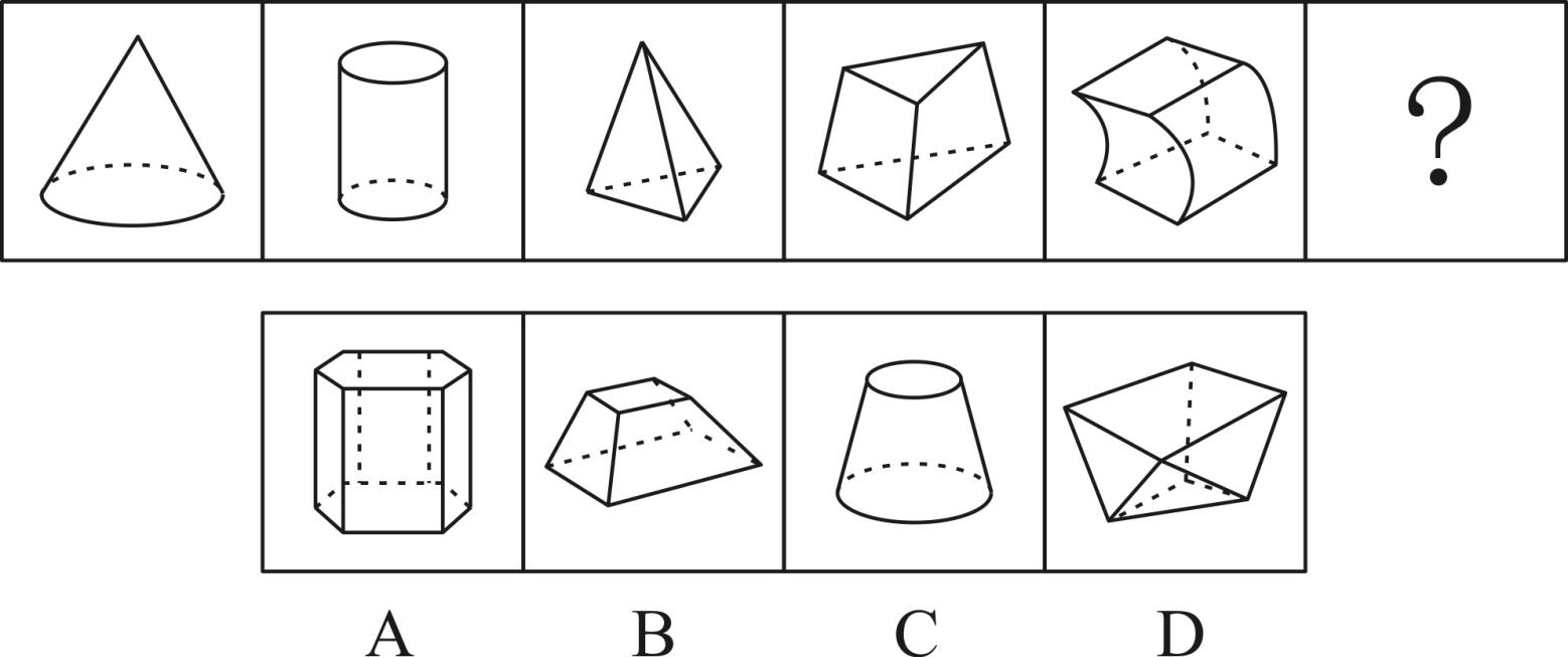 第一步,观察特征。组成元素不同,优先考虑数量类或属性类。属性特征不明显,优先考虑数量类。第二步,一条式,从左到右找规律。每个图形都是立体图形,第一个圆锥体是一个圆形底面和侧面两个面组合而成,第二个圆柱体是由上下底面和侧面三个面组合而成,第三个四面体共4个面,图4和图5分别由5个面和6个面组合而成,所以问号处应选择一个由7个面组成的立体图形,只有D项符合。