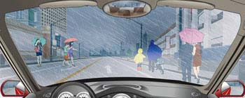 雨天遇到这些撑雨伞和穿雨衣的行人在路边行走怎样通行?A、注意观察行人动态 B、适当降低车速 C、保持安全距离 D、提前轻按喇叭提醒