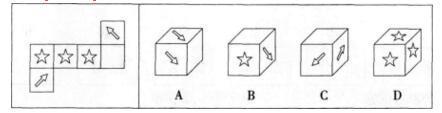 含箭头的两个面是相对面不可能相邻,排除A、C;含五角星的三面不可能两两相邻,排除D;B项可由左边展开图折成。